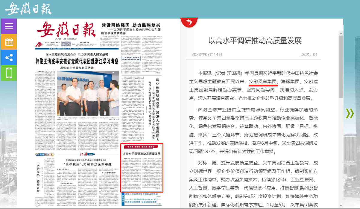 查看詳情 >《安徽日報》報道安徽叉車集團以高水平調研推動高質量發(fā)展情況